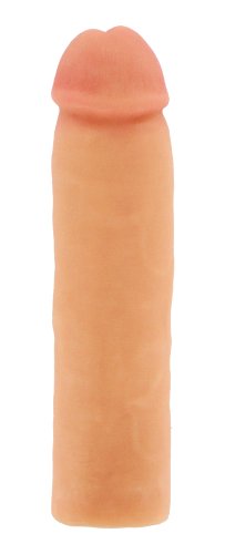 Are you ready to please your partner with a big fat penis? Slide into the Fat Jack Penis Enlarger and your wish is granted! A thick, stretchy sleeve fits snugly around your shaft, and at the end is a solid, SexFlesh extension that gives you another 2 inches in length. Fat Jack does not stop at making your penis longer - the thick walls of the sheath add almost an inch to your width as well! This lifelike material is firm, yet squeezable, just like the real thing, which makes the experience enjoyable for both you and your partner. Imagine penetrating your lover with a huge, girthy, realistic penis head and shaft; much better than a dildo - you control the action with each thrust of your hips! For a custom fit, the bottom of the sleeve can be trimmed with scissors to the perfect length for you. Measurements: 8.75 inches long, 2.25 inch max width (sleeve only, width may increase when penis is inserted), solid extension portion is approximately 2 inches long, sleeve walls are approximately 0.5 inches thick, Material: SexFlesh (TPR), Color: Natural